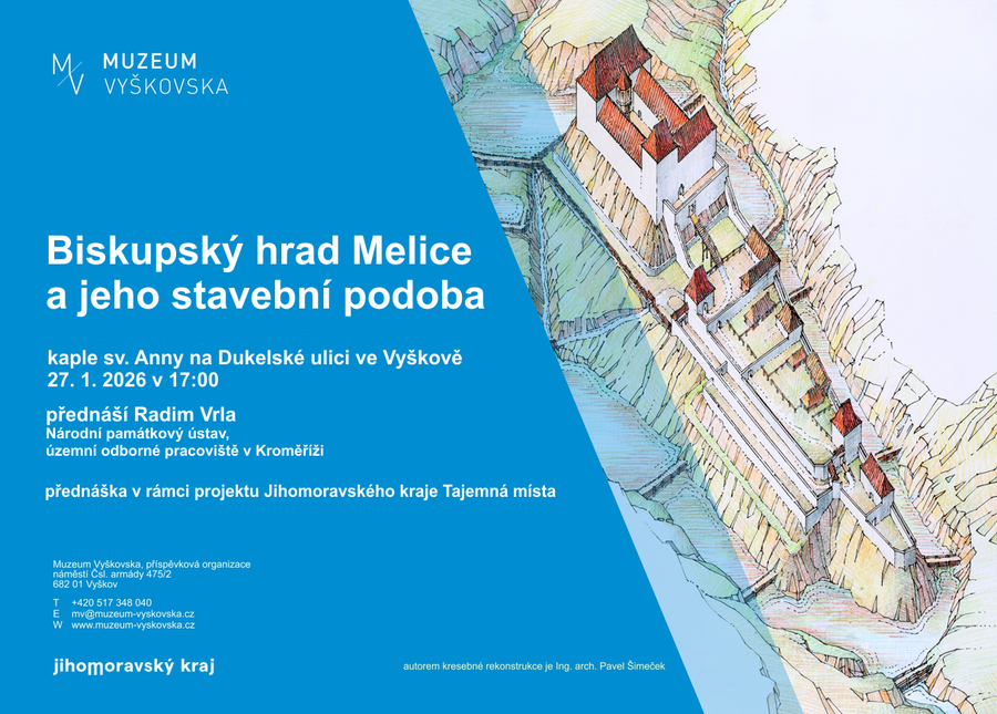 Muzeum Vyškovska vás srdečně zve v úterý 27. 1. 2026 od 17.00 hodin do kaple sv. Anny na Dukelské ulici na přednášku Biskupský hrad Melice a jeho stavební podoba. Přednášet bude pan Radim Vrla z Národního památkového ústavu. Cílem přednášky je na základě nalezených artefaktů i dochovaných zřícenin zrekonstruovat pravděpodobnou stavební a architektonickou podobu této zapomenuté perly mezi moravskými hrady. Vstup je zdarma.