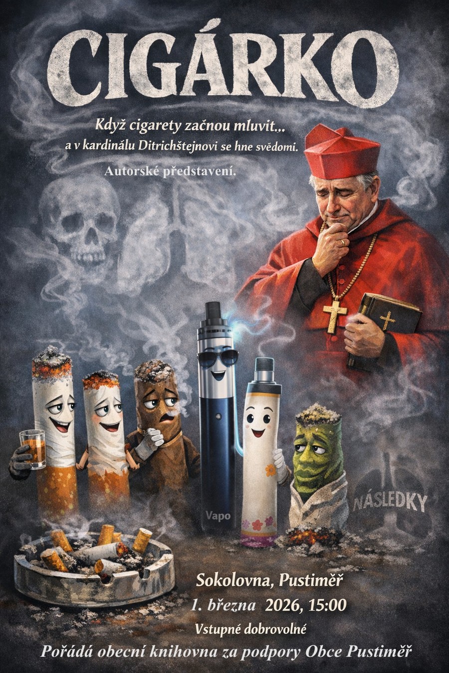 Obecní knihovna v Pustiměři za podpory obce Pustiměř pořádá v neděli 1. března premiéru autorského představení CIGÁRKO. Začátek je v 15.00 hodin v místní Sokolovně. Vstupné je dobrovolné. Všichni jste srdečně zváni.