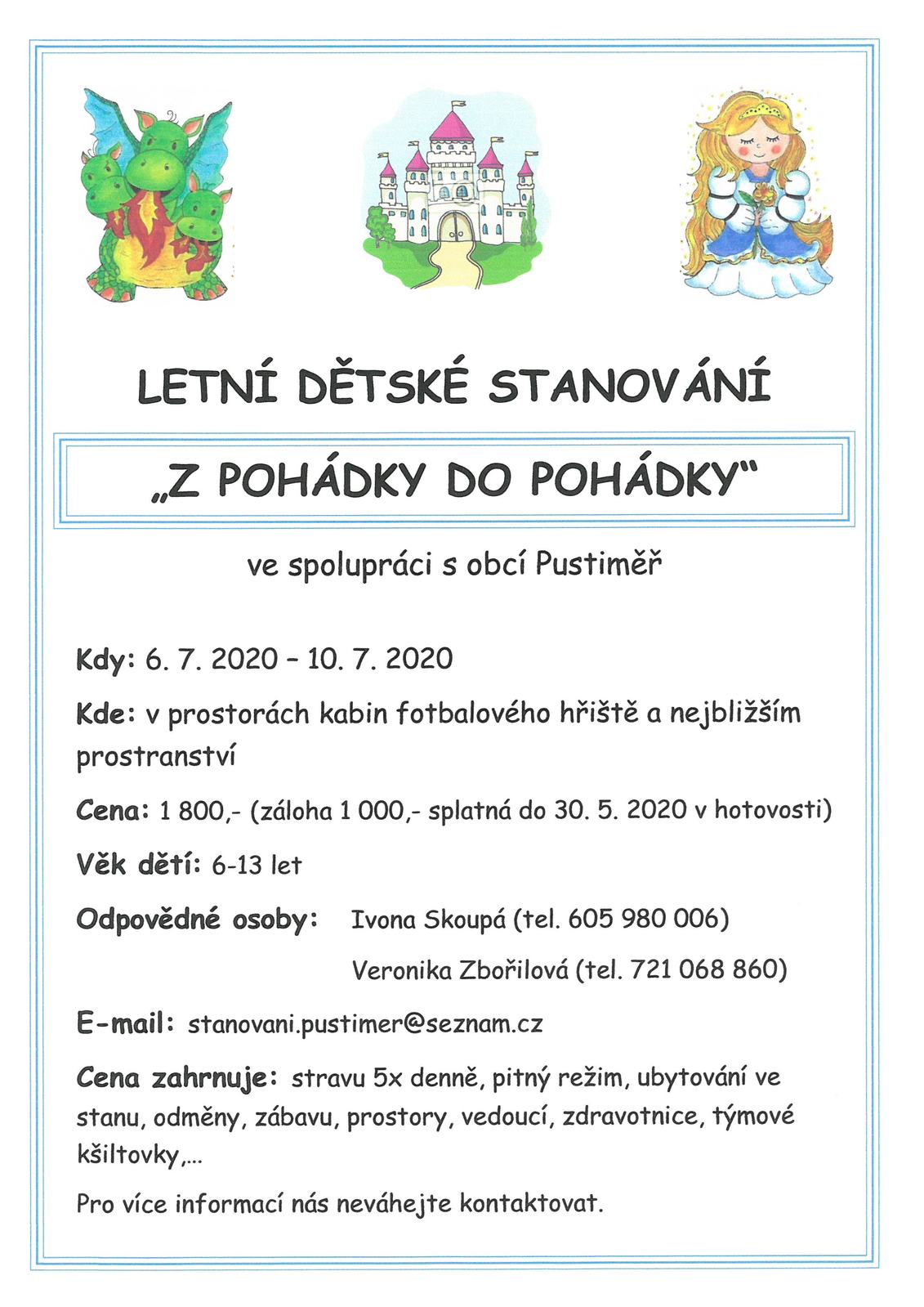 Organizátorky tábora Ivona Skoupá a Veronika Zbořilová pořádají ve spolupráci s obcí Pustiměř letní dětské stanování „Z pohádky do pohádky“. Stanování se uskuteční od 6. do 10. července na prostranství u kabin na fotbalovém hřišti. Akce je určena pro děti od 6 do 13 let. Cena za tábor je 1.800,-Kč a zahrnuje stravu, ubytování ve stanu, program a další nezbytné organizační náležitosti. Ohledně přihlášek a dalších informací kontaktujete organizátorky tábora, a to na číslech 605 980 006 nebo 721 068 860, příp. na e-mailu stanovani.pustimer@seznam.cz.