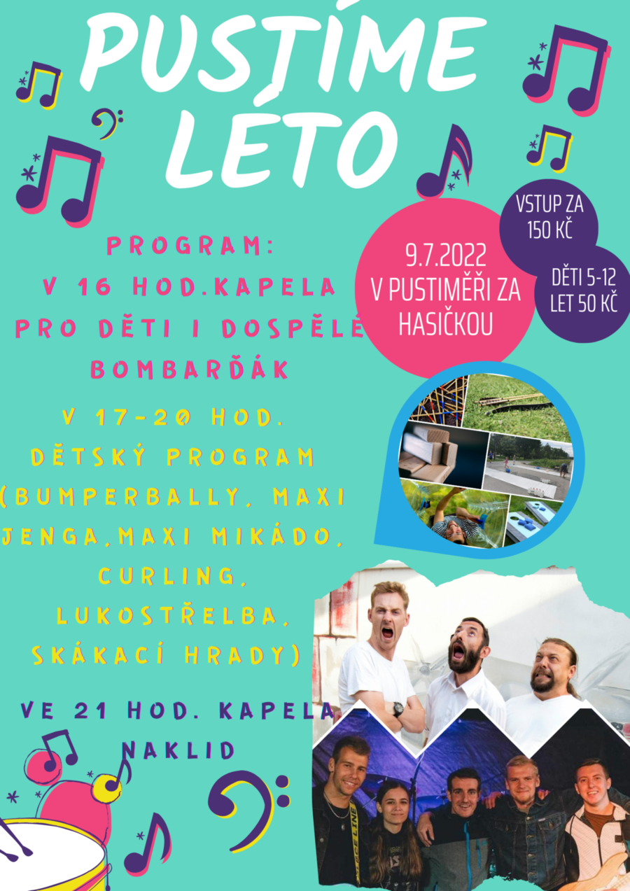 V sobotu 9. 7. 2022 se v areálu za hasičskou zbrojnicí uskuteční akce s názvem PustímeLéto. Jedná se o letní noc se zábavným odpolednem pro děti i dospělé. V 16 hodin odstartuje akci kapela Bombarďák s koncertem pro děti plným písní a tanečků. Chybět nebude ani interaktivní komunikace s dětmi a slovní fórky k pobavení dospělého doprovodu. Od 17 do 20 hodin se můžete těšit na dětský program. Připraveny jsou bumberbally, maxi jenga, maxi mikádo, curling, lukostřelba a skákací hrady. Od 21 hodin zahraje kapela NaKlid nejznámější hity Kabátů, Chinaski, Arakainu a dalších kapel. Vstupné je 150 Kč a děti od 5 do 12 let mají vstup za 50 Kč. Těšíme se na vaši účast.