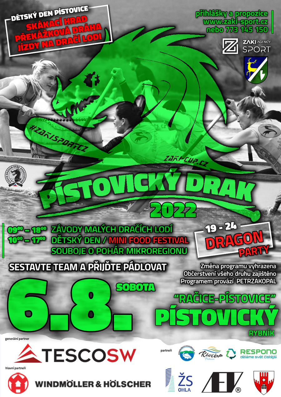 V sobotu 6. 8. 2022 se na Pístovickém rybníku uskuteční 2. ročník závodu dračích lodí - Pístovický drak. Zúčastnit se mohou týmy kamarádů, spolupracovníků nebo rodin. Více informací včetně možnosti přihlášení získáte na zaki-cup.cz nebo na facebooku Pístovický drak 2022 | Facebook. V místě bude probíhat i Dětský den a MINI FOOD festival. Připraveny jsou aktivity pro děti a dospělé.