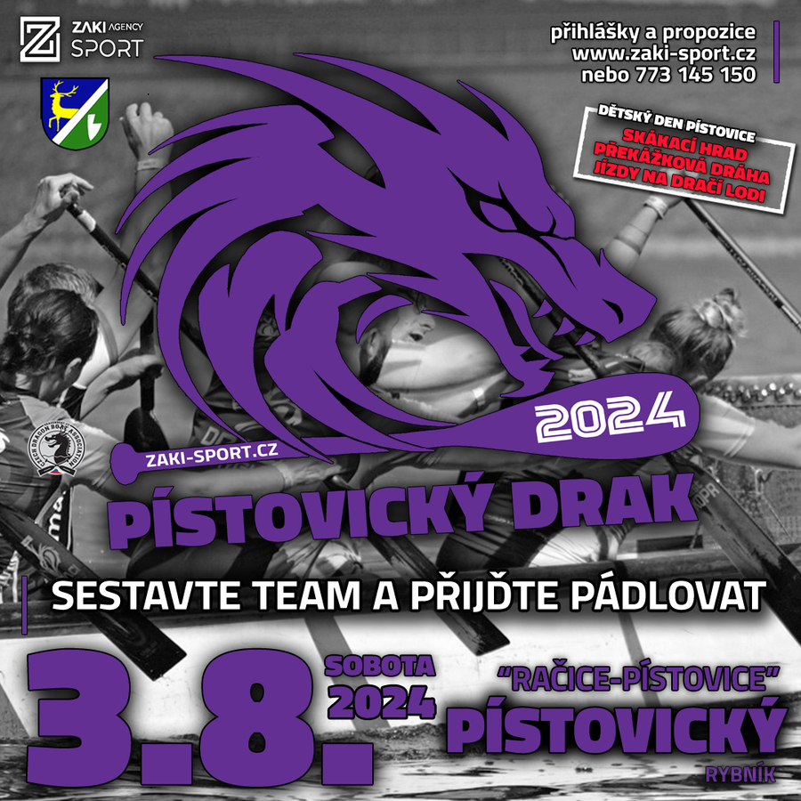V sobotu 3. srpna se na Pístovickém rybníku uskuteční 4. ročník závodu malých dračích lodí Pístovický drak 2024. Současně bude probíhat i Dětský den Pístovice. Těšit se můžete na aktivity pro děti i dospělé (skákací hrad, nafukovací překážková dráha), chybět nebude ani občerstvení.