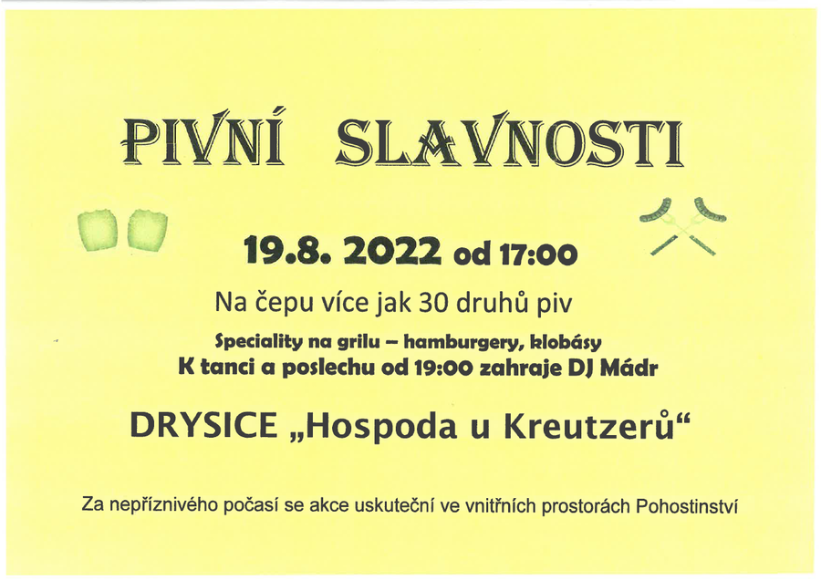 Pohostinství v Drysicích pořádá v pátek 19. 8. 2022 od 17.00 hodin Pivní slavnosti. V průběhu akce bude možné degustovat více než 30 druhů piv malých pivovarů. Od 19.00 hodin zahraje k tanci a poslechu DJ Mádr. Po celou dobu akce budou podávány hamburgery a klobásy z grilu. V případě nepříznivého počasí se akce uskuteční ve vnitřních prostorách pohostinství. Pořadatelé se těší na vaši návštěvu.