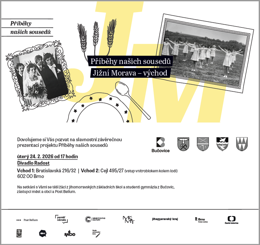 V úterý 24. února od 17.00 hodin se v Divadle Radost v Brně uskuteční slavnostní závěrečná prezentace projektu Příběhy našich sousedů. Mezi prezentujícími žáky jihomoravských škol  nebudou chybět ani žáci naší základní školy. Všichni se těší na setkání s Vámi.