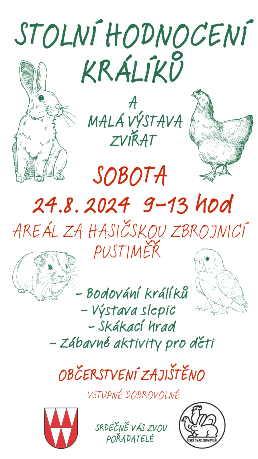 Členové svazu chovatelů v Pustiměři si Vás dovolují pozvat na stolní bodování a výstavu králíků, slepic a morčat, která se bude konat v sobotu 24. srpna 2024 od 9.00 do 15.00 hodin v areálu za hasičskou zbrojnicí. Pro děti bude připraven skákací hrad. Občerstvení zajištěno, vstupné je dobrovolné. Na Vaši návštěvu se těší pořadatelé.