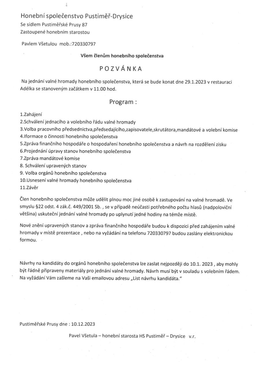 Honební společenstvo Pustiměř - Drysice zve všechny své členy na jednání valné hromady, která se bude konat 29. 1. 2023 od 11.00 hodin v restauraci Adélka.