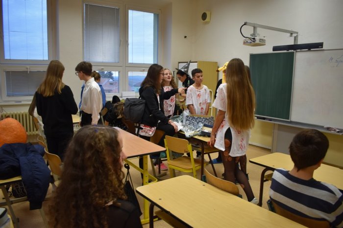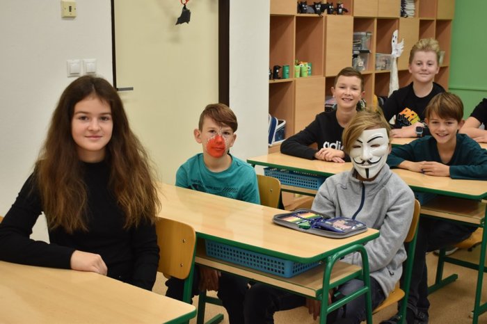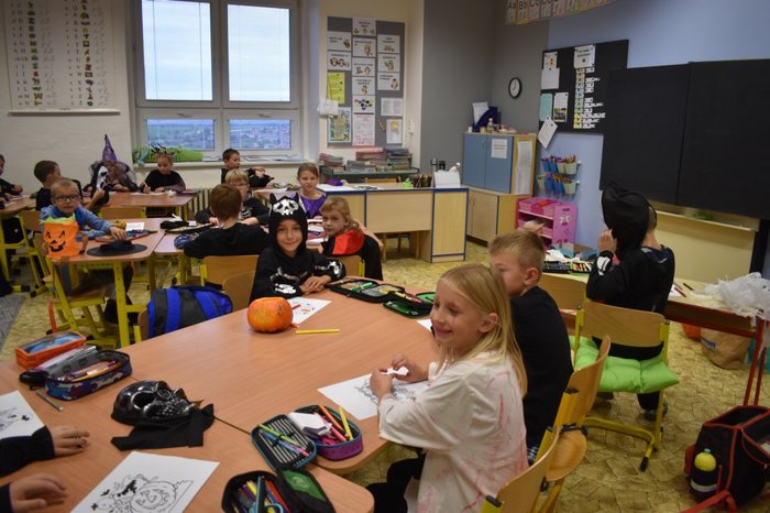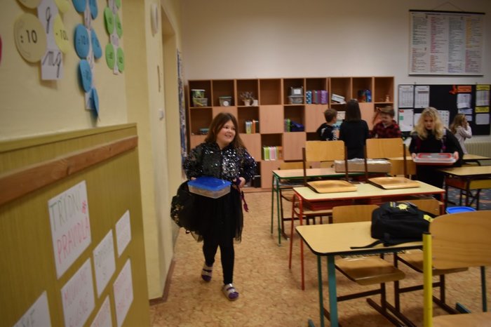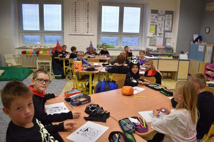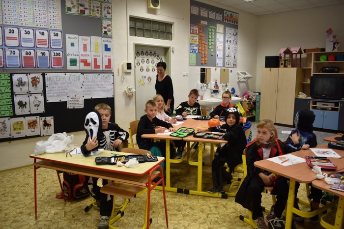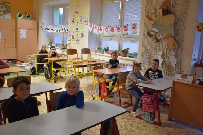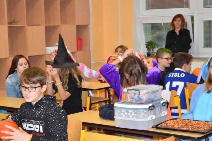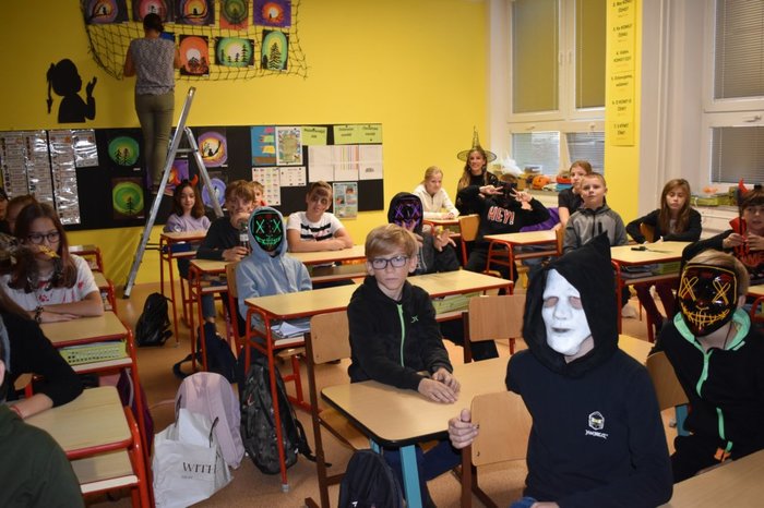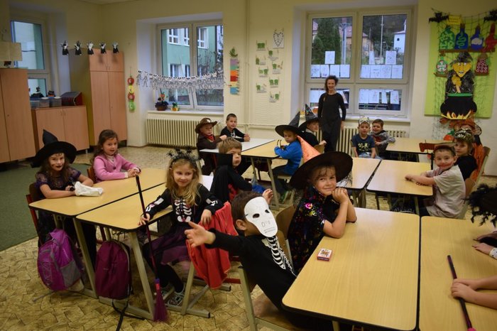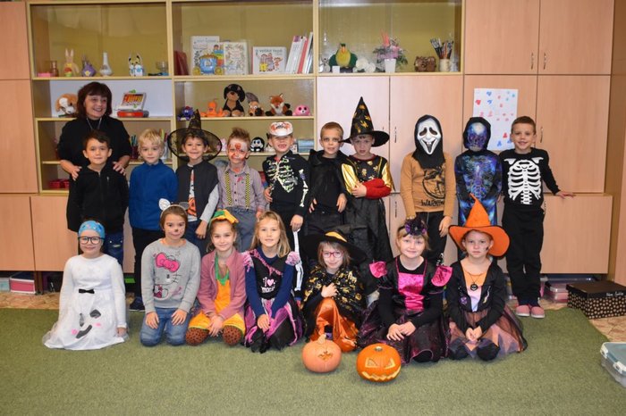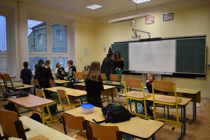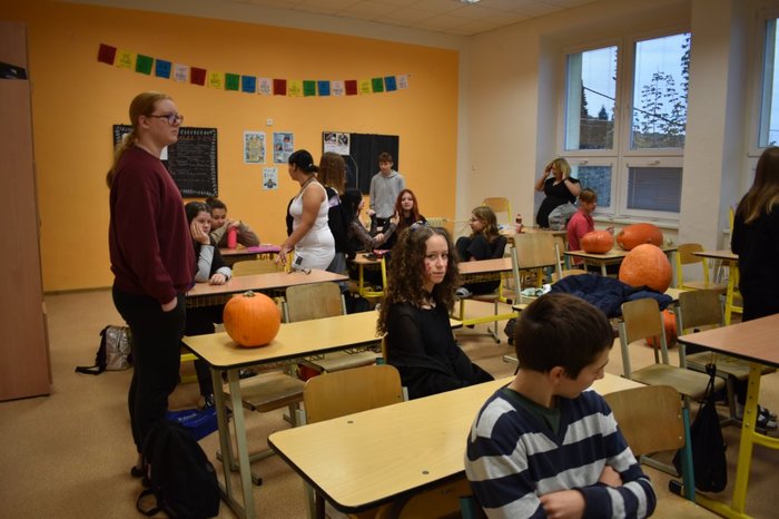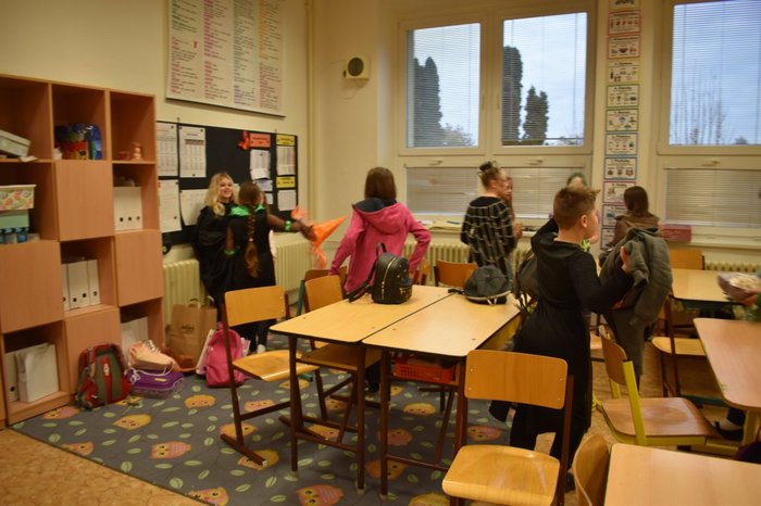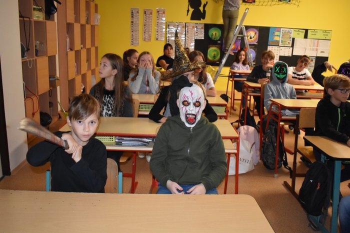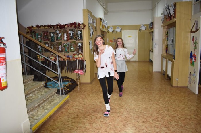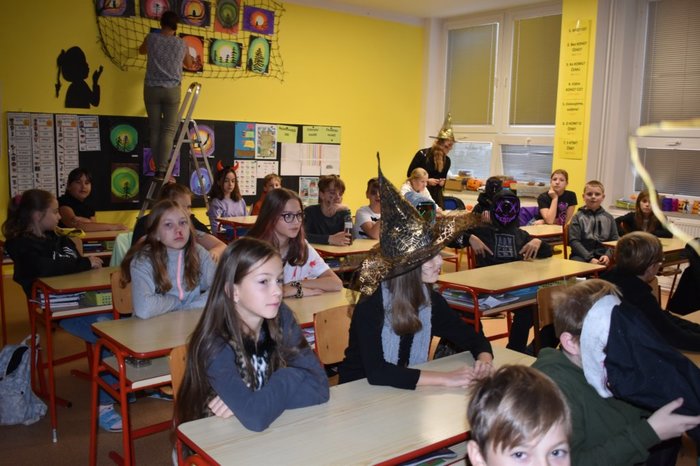 Škola byla plná kouzelných postav, které vyzdobily školu, vyřezaly překrásné dýně a průvodem kolem školy děkovaly za vše příznivé, co nám přinesl letošní rok, aby se začaly připravovat na nadcházející zimu.